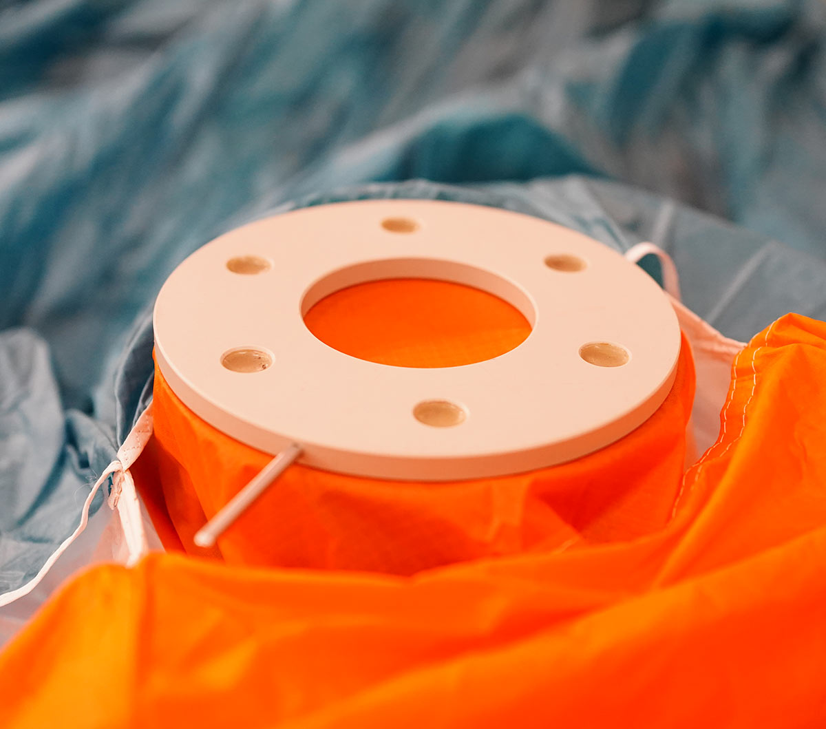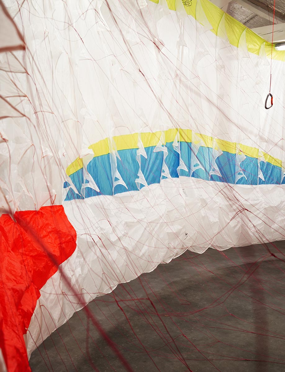 Tissus extrados et intrados, cloisons (nervures, diagonales et bandes de tensions), pattes d’attache et coutures.