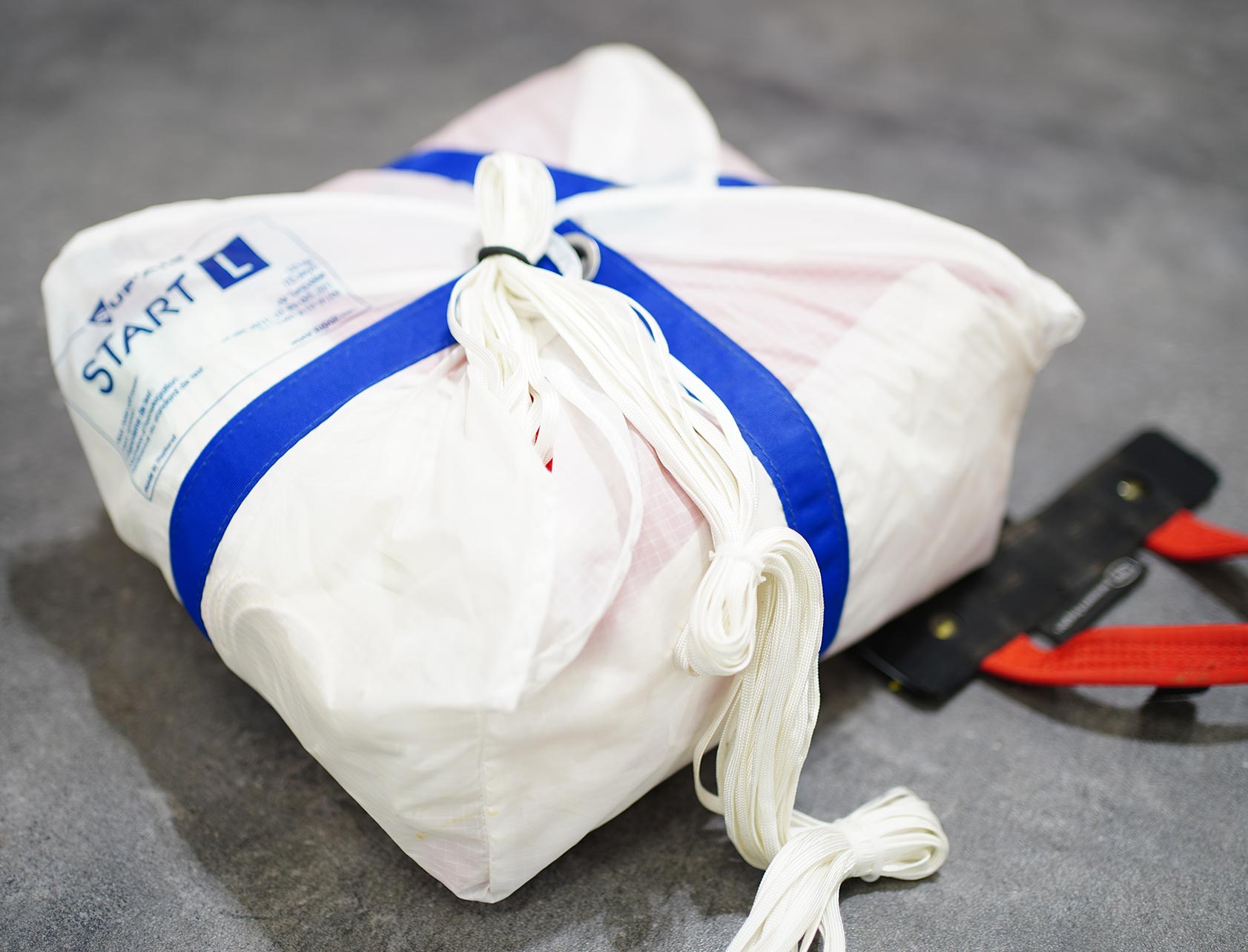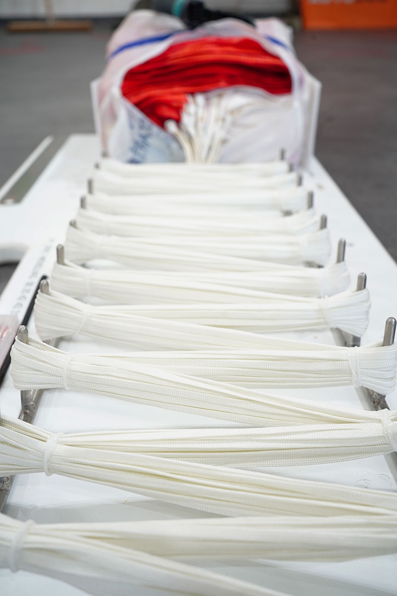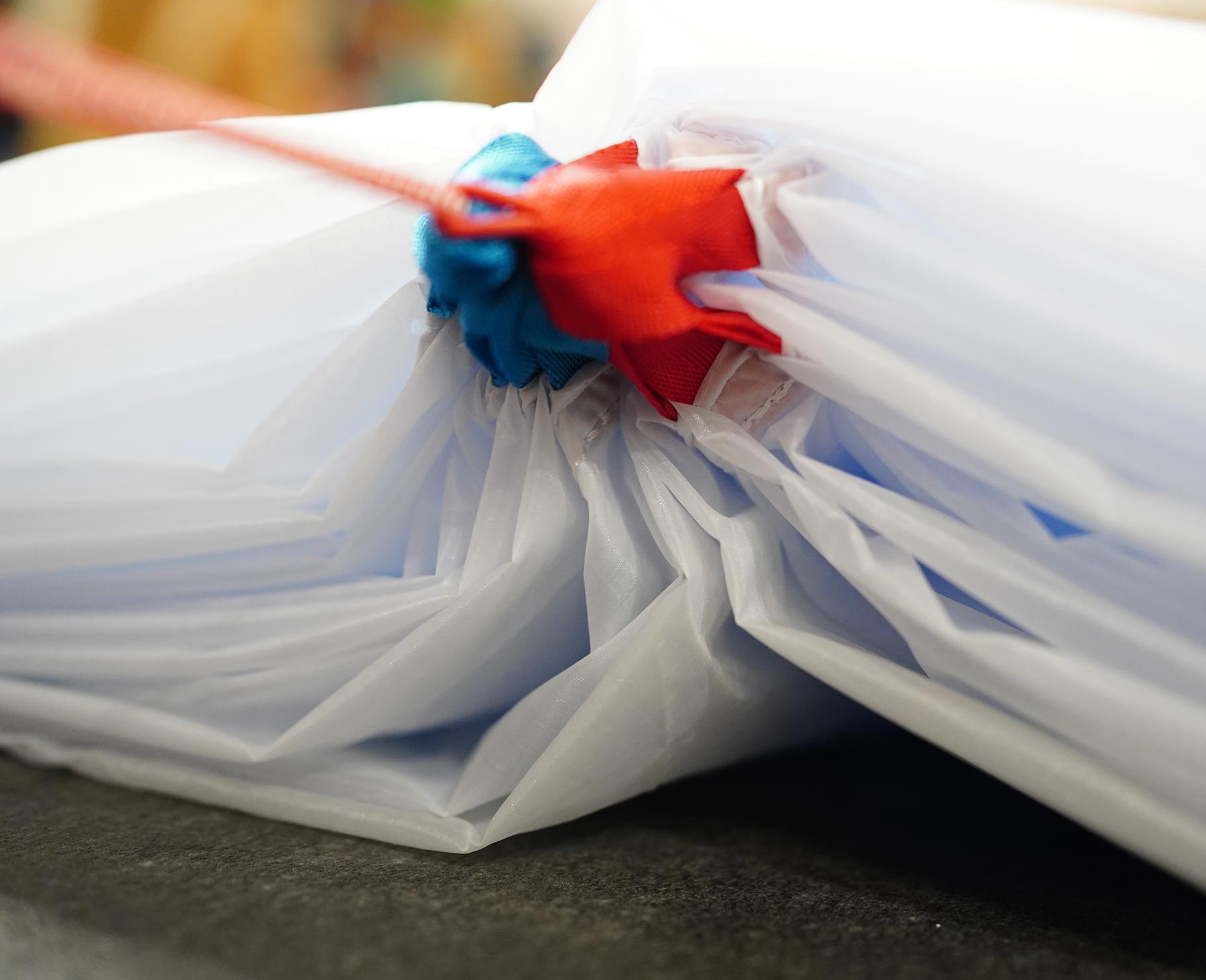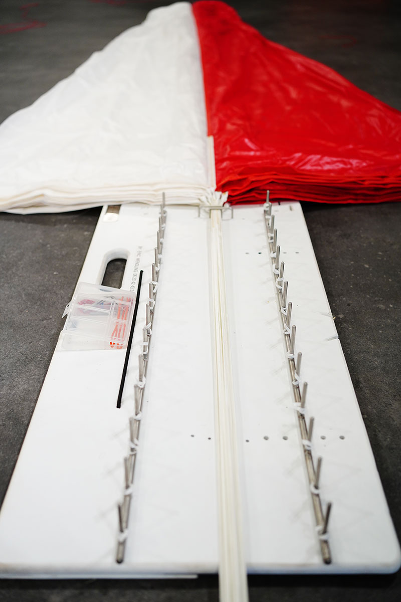 Étapes de pliage du secours parapente dans les locaux de L’Atelier Volant