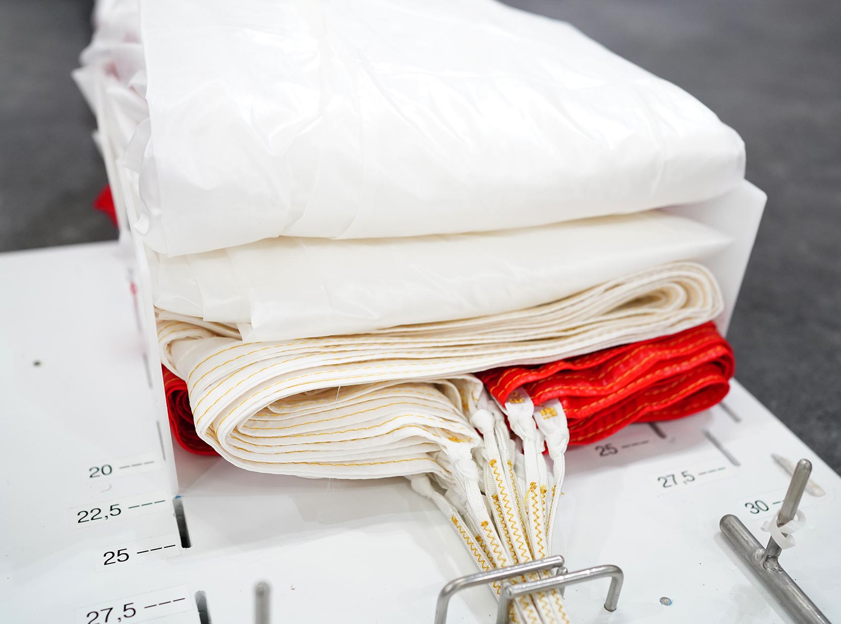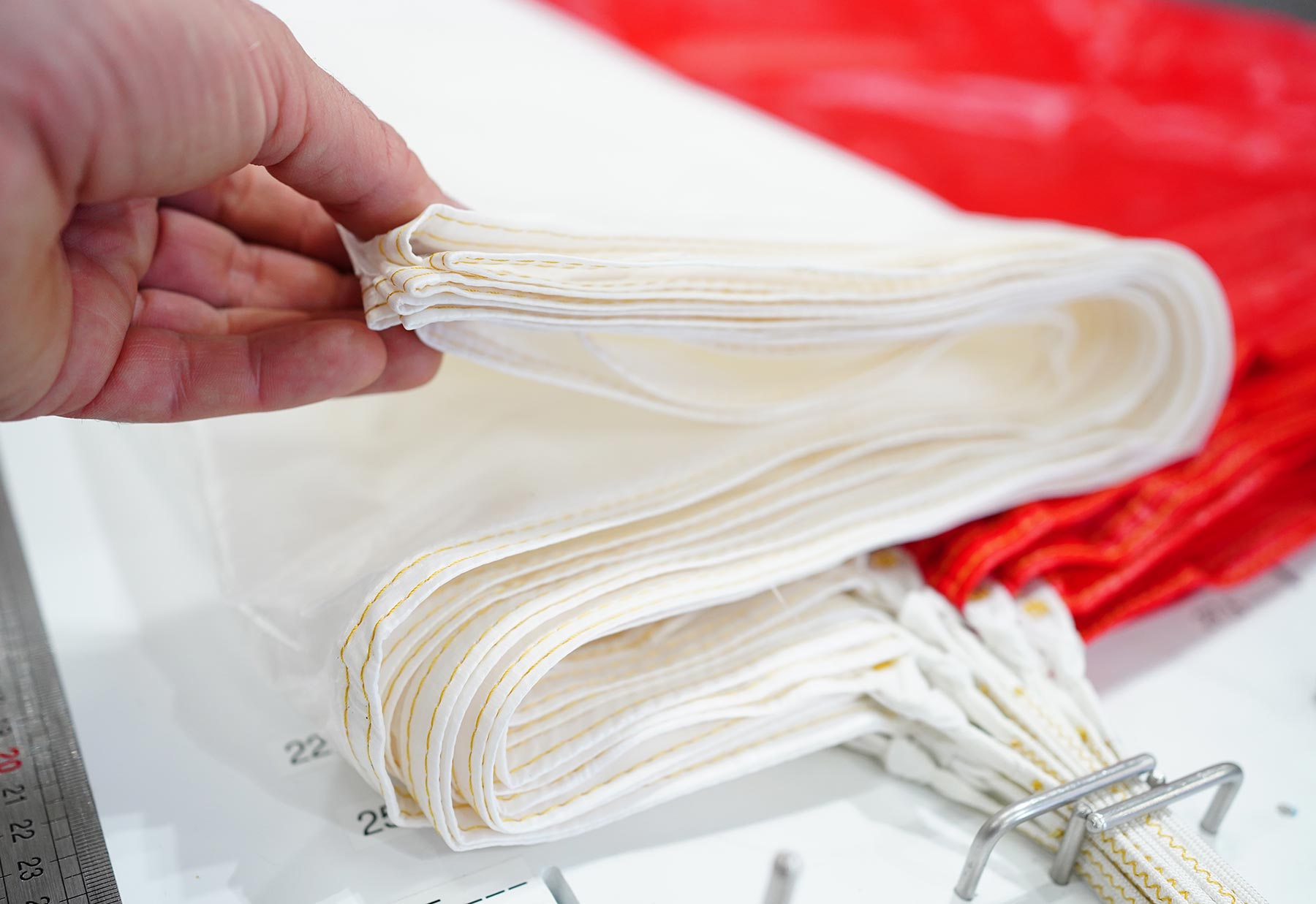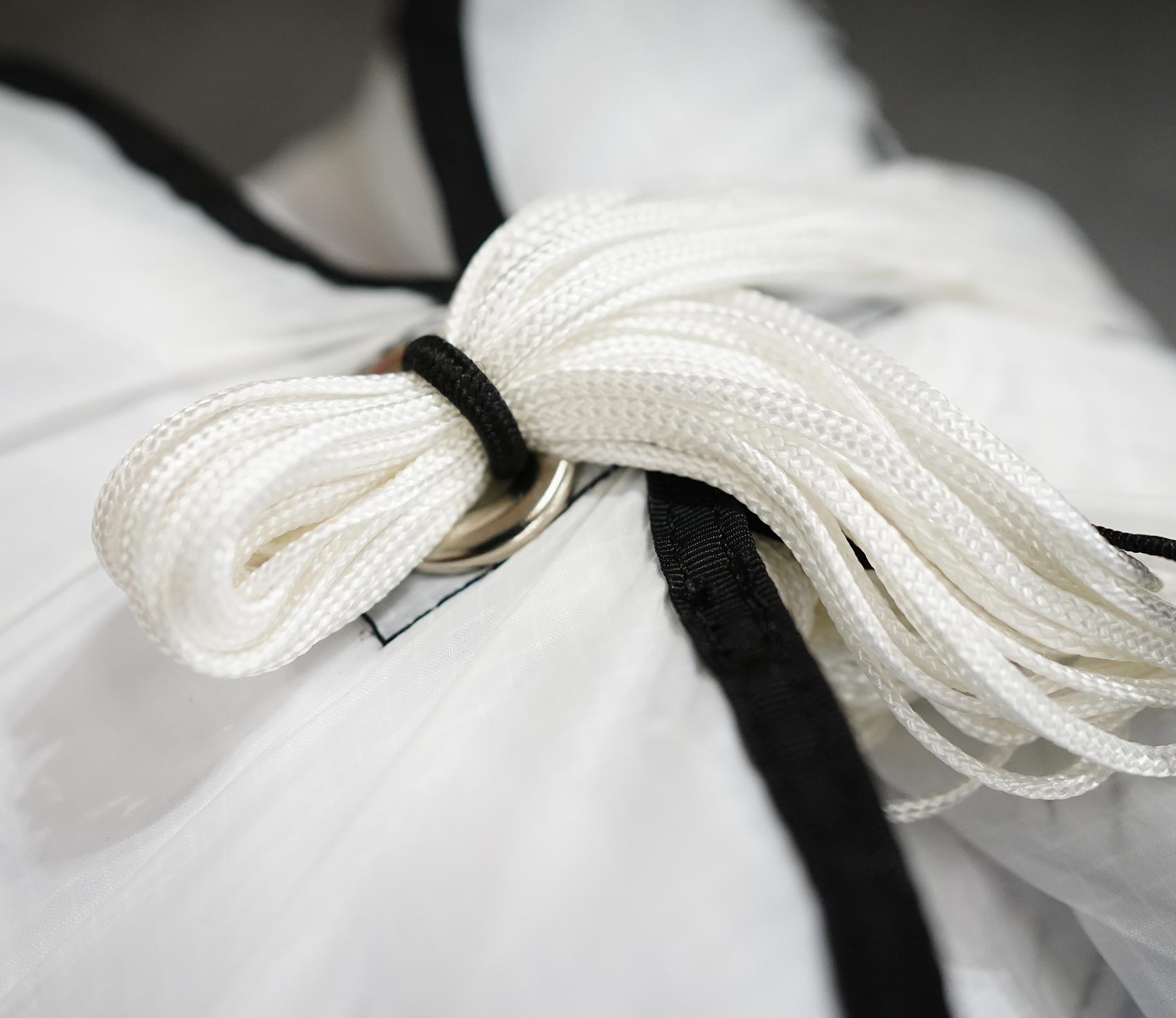 Étapes de pliage du secours parapente dans les locaux de L’Atelier Volant